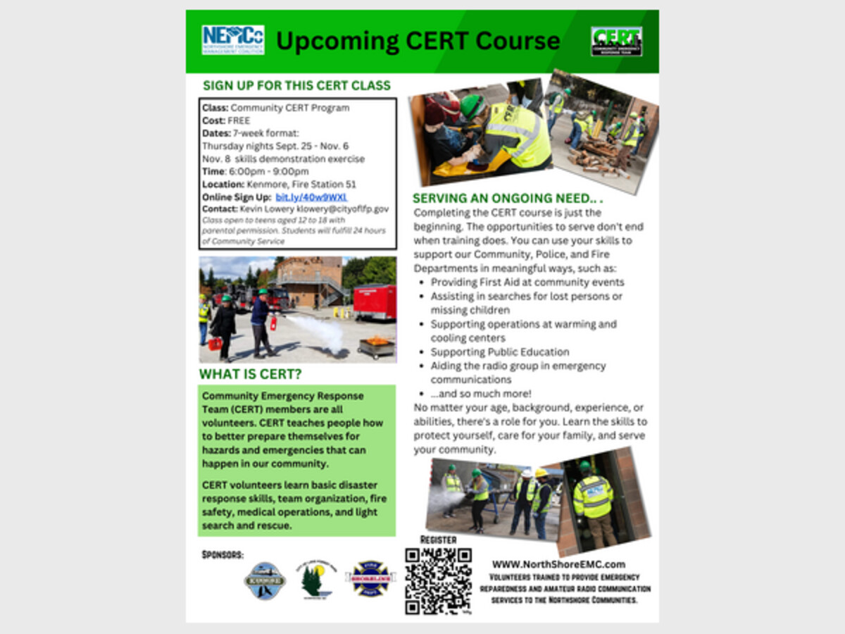 The Northshore Emergency Management Coalition (NEMCo) is pleased to offer the Community Emergency Response Team (CERT) Basic Training, beginning Thursday, September 25, 2025.