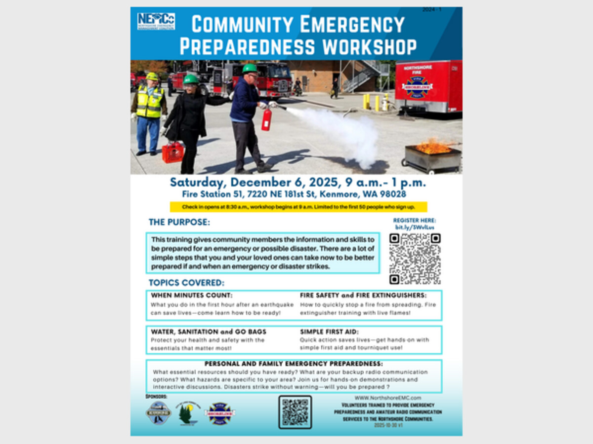 NEMCo is excited to host its annual Community Emergency Preparedness Workshop on Saturday, December 6, 2025, at Kenmore Fire Station 51.