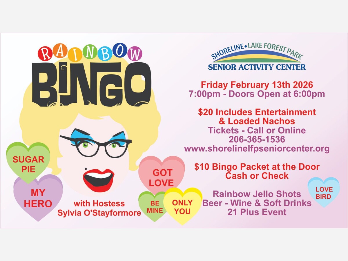 Shoreline/Lake Forest Park Senior Activity Center is hosting its monthly RAINBOW BINGO fundraiser with the fabulous Sylvia O’Stayformore on Friday, February 13, 2026—doors open at 6:00pm and games begin at 7:00pm!