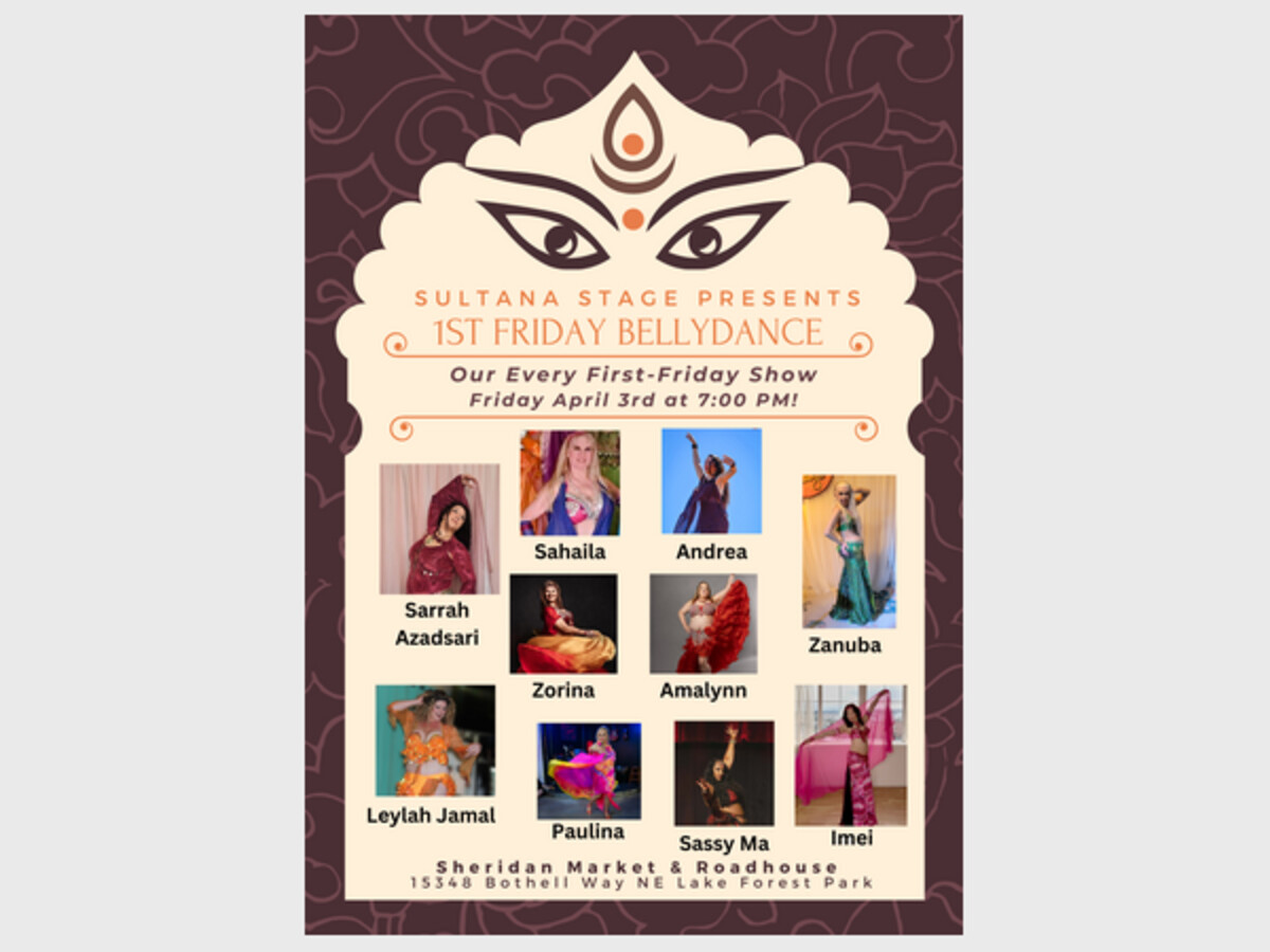 Come join us Friday March 6th at 7PM for our Jam Packed First Friday Show! Dancing for your pleasure will be Andrea, Imei, Sarrah Azadsari, Leylah Jamal, Zorina, Sahaila, Amalynn, Zanuba, Sassy Ma as well as your Hostess Paulina!