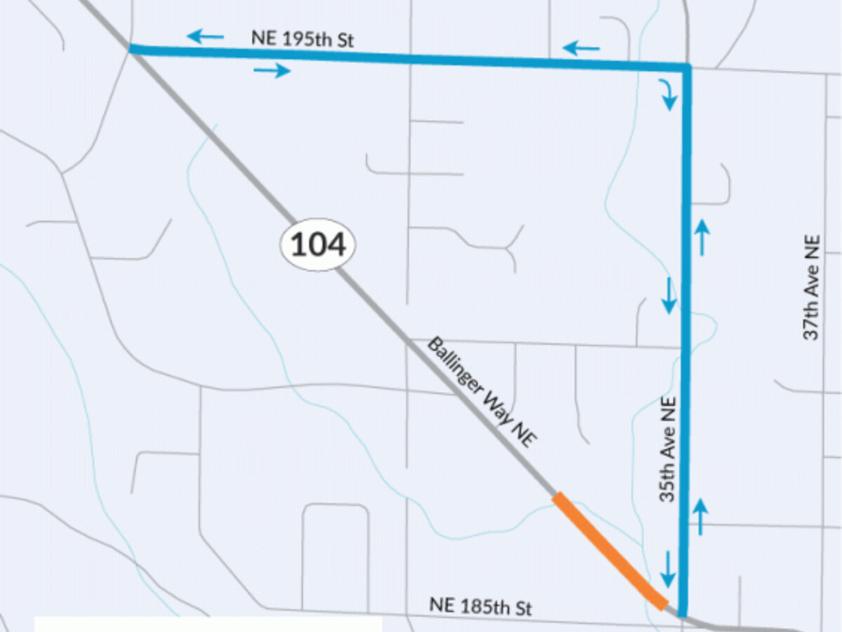 Starting at 12:01 a.m. on Thursday, Sept. 4, both directions of SR 104/Ballinger Way Northeast will be closed near 35th Avenue Northeast for at least 35 days. The closure includes all travel lanes and sidewalks.
