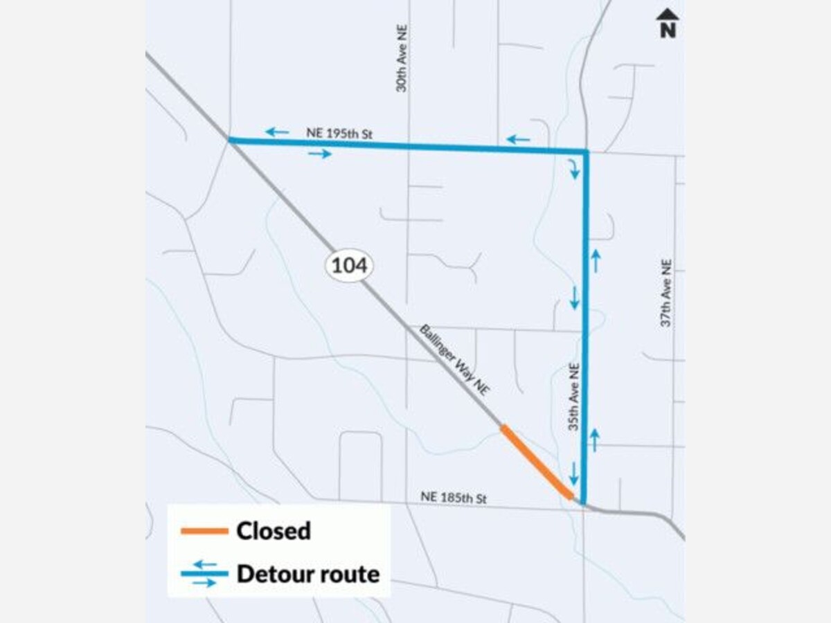 Starting at 12:01 a.m. on Thursday, Sept. 4, both directions of SR 104/Ballinger Way Northeast will be closed near 35th Avenue Northeast for at least 35 days. The closure includes all travel lanes and sidewalks.
