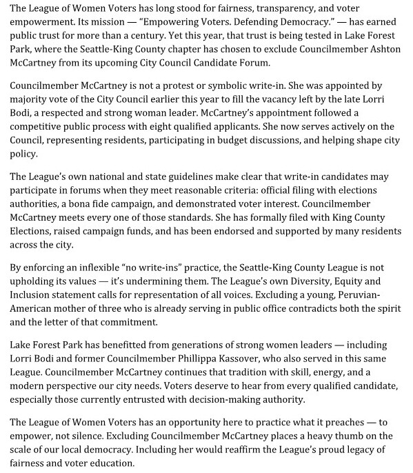 I was surprised by the League of Women Voters stance on not including Ashton McCartney as a candidate in the debate tomorrow. She was chosen as a replacement for the open position and sworn in AFTER the deadline for King County Elections. That is why she has to be a write in candidate for Position 2.