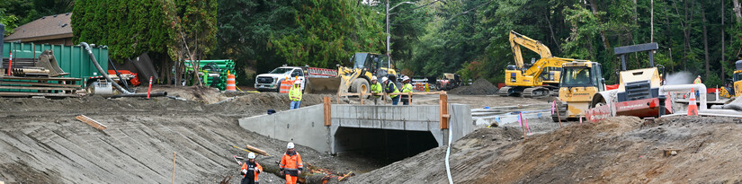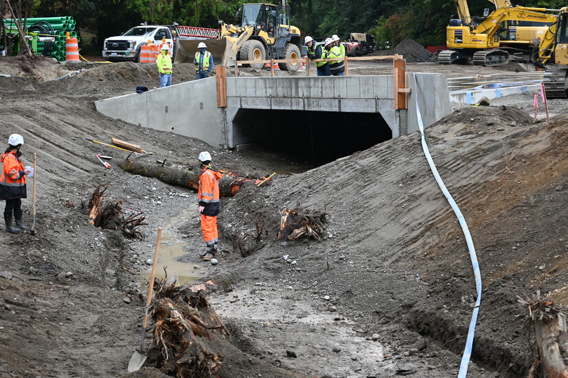 As of now, the project remains on track to reopen all lanes on SR 104/Ballinger Way NE by the end of the day on Oct. 31. There have been no new changes to the schedule. We reached an important milestone on Friday, Oct. 10, when we reintroduced Lyon Creek beneath the new culvert/bridge structure.