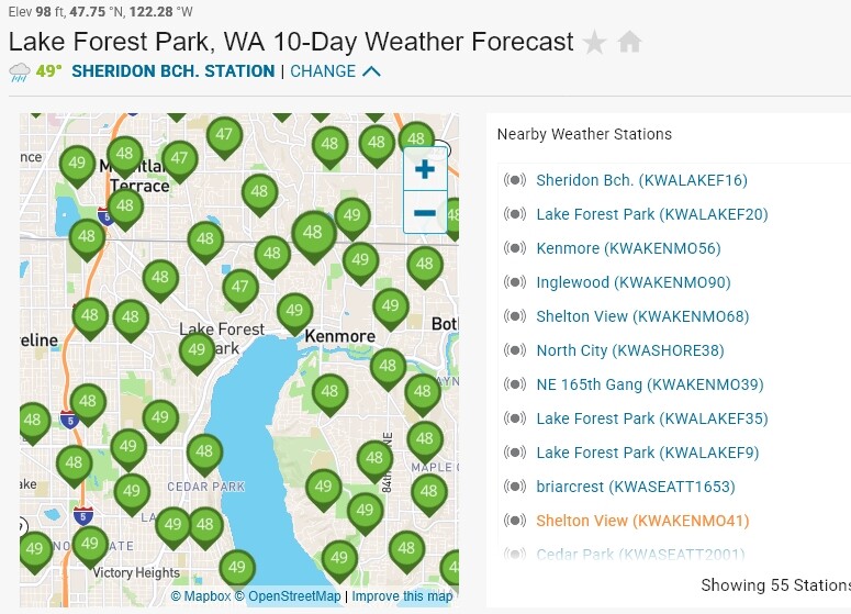 So whatever your weather app of choice is, find one that predicts rainfall in inches, like this one. Weather Underground taps into home weather stations of which there are five or so just in LFP alone. This map is set to show current temperature: