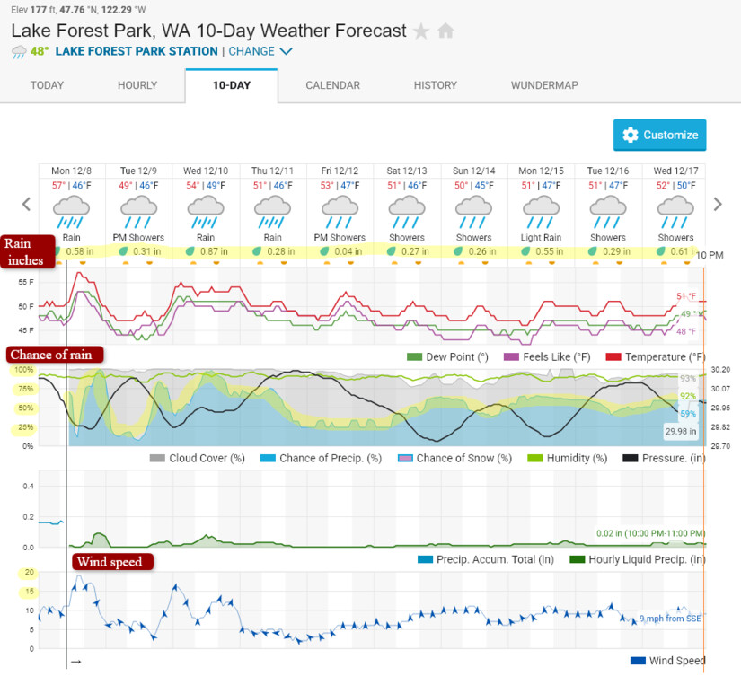 The Rainageddon event being talked about so much in the media doesn't appear to be affecting our fair city any more than typical weather for this time of year. Note the highlighted "rain in inches" part of the graph: