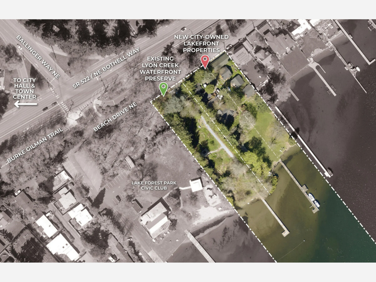 Proposal: Improve public waterfront access through the transition of two recently acquired single-family residential properties into a public waterfront park. The newly acquired properties will be integrated with the existing Lyon Creek Waterfront Preserve to form one continuous public park. New project improvements will be focused on the two recently acquired parcels, while the existing public preserve parcel will be modified to reduce public access to the stream buffer and environmentally sensitive area at the stream’s outfall to Lake Washington.