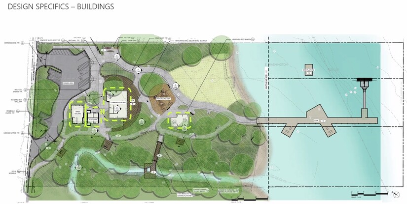 New project improvements include a new limited parking area, access paths, play structure, picnic structure, nature viewing platforms, and new swimming and paddling dock and recreational float. The existing primary single-family dwelling and one existing accessory unit will be renovated for flexible community use, and a bathhouse will be constructed in the footprint of the existing garage building. Other existing accessory structures will be permanently removed from the site. Two existing docks will be removed and consolidated into a single dock for public water access uses. An existing footbridge crossing Lyon Creek is proposed to be relocated from the stream and reinstalled within the stream floodplain.