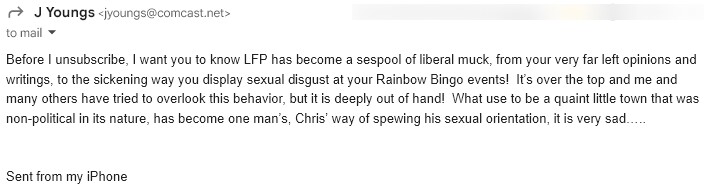 You also mentioned that our town “used to be non-political.” We agree—it’s a lovely idea. Unfortunately, history suggests that towns are rarely non-political; they simply reflect whoever happens to live in them. And, somewhat inconveniently for the culture police, some of those residents turn out to be LGBTQ+. I’ve resided here for over 50 years, and our little city has always been progressive and welcoming to everyone.