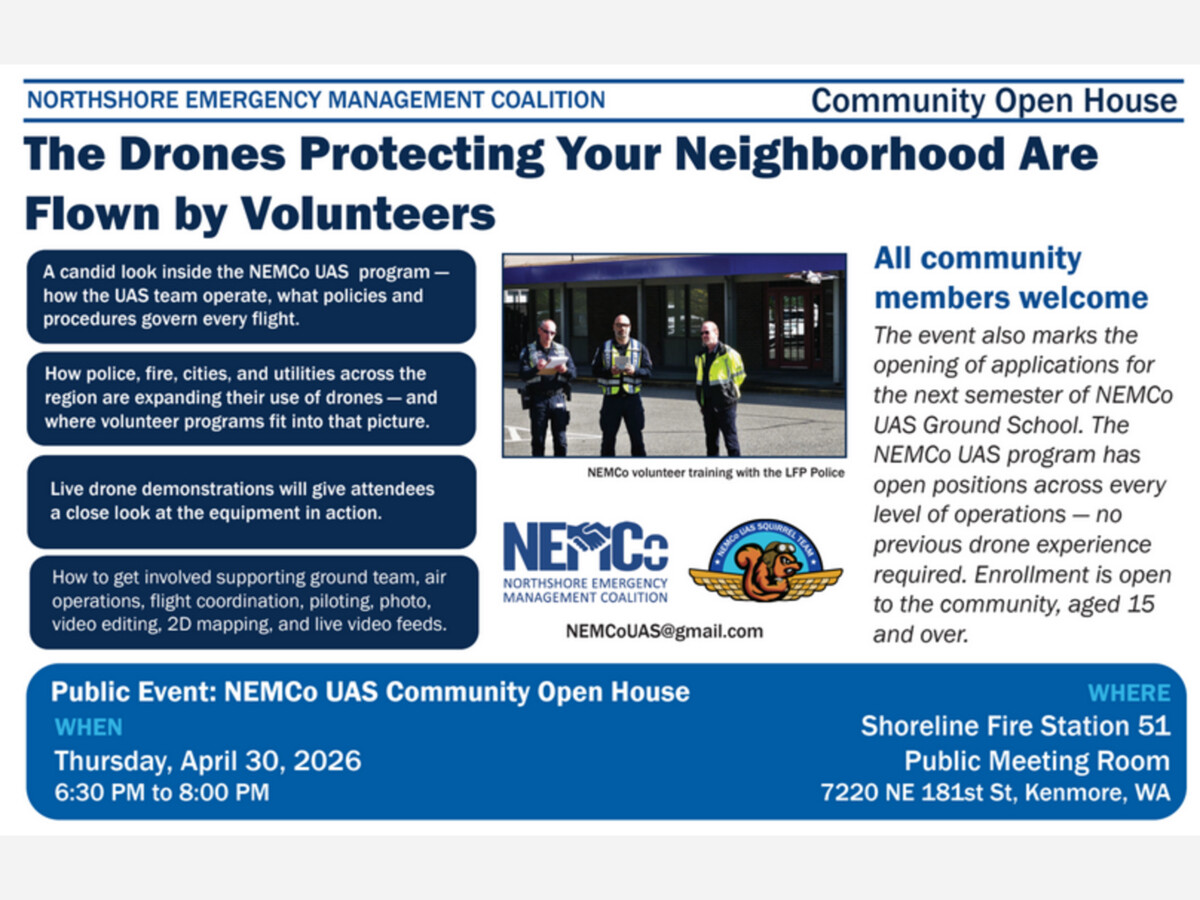 The NEMCo Air Squirrels, a volunteer UAS (drone) program operating across North King County, have spent the last two-and-a-half years building something rare: a fully deployable, professionally structured aerial program staffed entirely by community volunteers. They work alongside Lake Forest Park Police, the Shoreline Fire Department, the manager, and public utilities to provide aerial incident support.