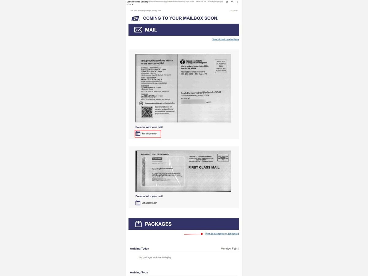 Informed Delivery provides eligible residential consumers with a digital preview of their household’s incoming mail scheduled to arrive soon.* Users can view greyscale images of the exterior, address side of incoming letter-sized mailpieces (not the inside contents) via email or an online dashboard. Now you'll know when that important piece of mail is coming and be sure to retrieve it without delay.